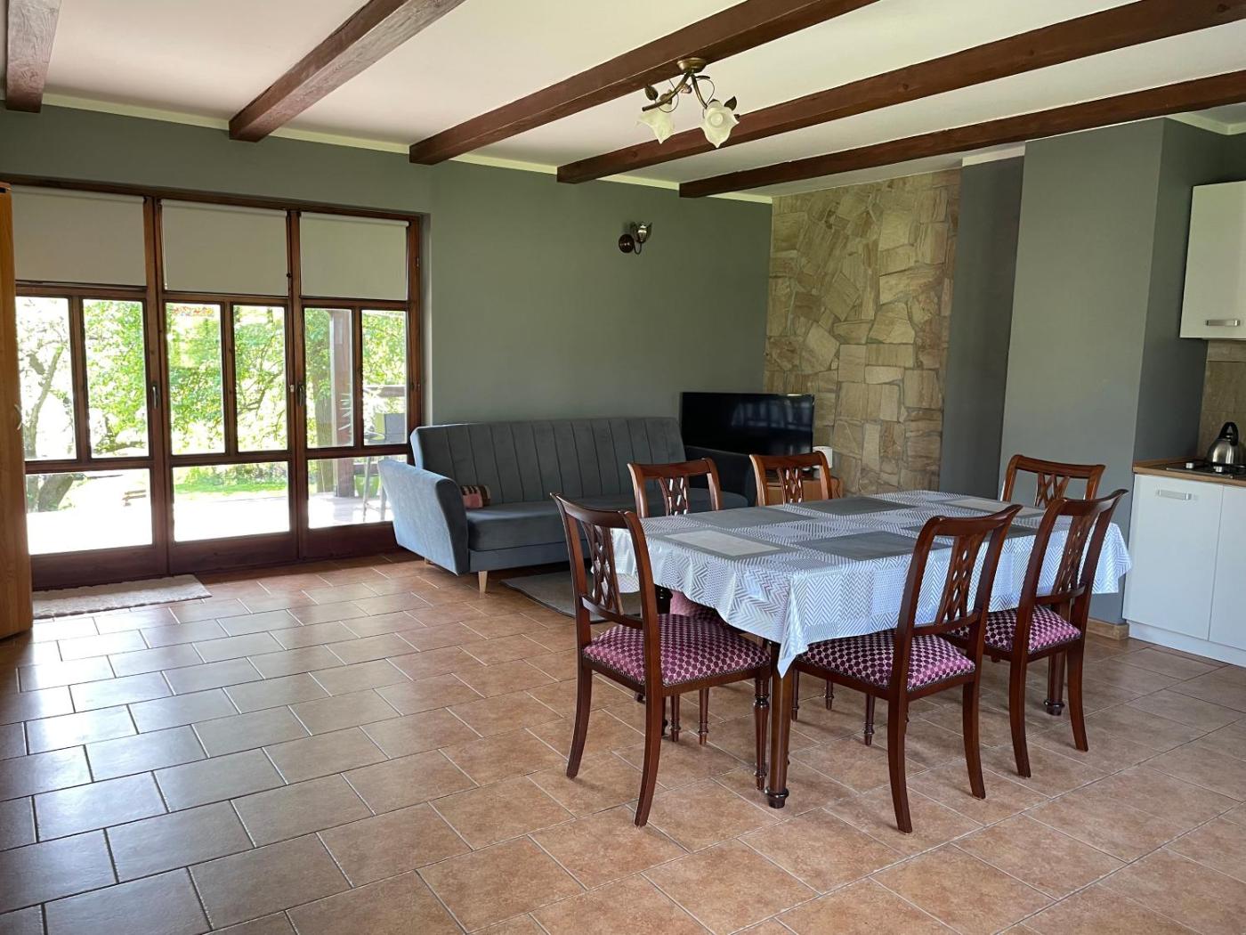 Apartament. Featuring a private entrance, this apartment also is comprised of 1 separate bedroom, 1 bathroom with a shower, a kitchen and a dining area. Guests will find a stovetop, a refrigerator and kitchenware in the kitchen. The apartment also has a barbecue. The apartment offers a tea and coffee maker, a seating area, a wardrobe, a flat-screen TV with cable channels, as well as garden views. The unit offers 1 bed. Apartament - 2 osobowy. Powierzchnia pokoju ok.: 20 mkw. ;