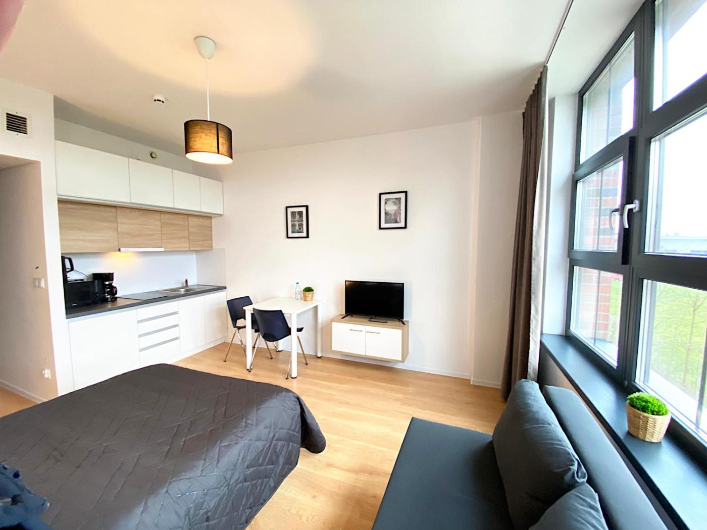 Apartament typu studio. Boasting a private entrance, this air-conditioned apartment features a kitchenette, 1 bedroom and 1 bathroom with a shower and a hairdryer. The well-fitted kitchenette has a stovetop, a refrigerator, kitchenware and a microwave. The apartment features a flat-screen TV with streaming services, a minibar, a tea and coffee maker, a seating area as well as city views. The unit has 2 beds. Apartament - 4 osobowy. Powierzchnia pokoju ok.: 26 mkw.